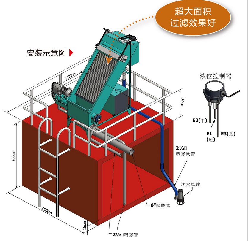 斜篩式幹濕分離器主體為由楔形鋼棒經製成的不鏽鋼平麵過濾篩麵,待處理廢水通過溢流堰均勻分布到傾斜篩麵上,由於篩網表麵間隙小、平滑,背麵間隙大,排水順暢,不易阻塞,固態物質被截留,過濾後的水從篩板縫隙中流出,同時在水力作用下,固態物質被推到篩板下端排出,從而達到固液分離目的。