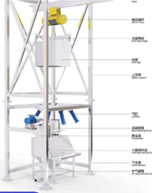 1、設備支架及護板;2、電動葫蘆;3、噸袋吊架;4、夾袋裝置;5、拍打、振動、磁選裝置;6、緩衝料倉;