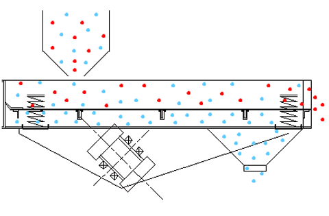 利用振動電機激振作為振動源,使物料在篩麵上呈跳躍式直線向前運動,物料從給料機均勻地進入篩分機的進料口,通過多層篩網產生數種規格的篩上物、篩下物、分別從各自的出口排出。